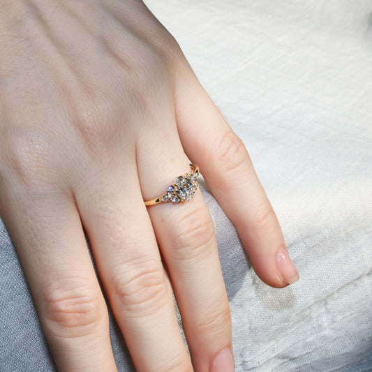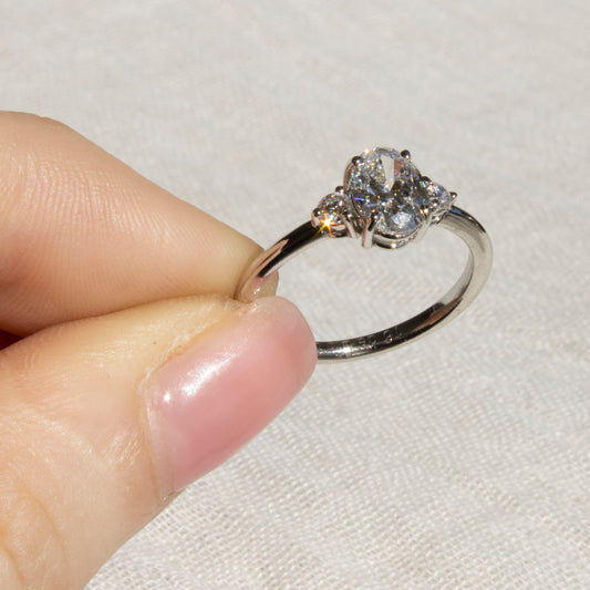 Diseño tresillo, una gran manera de extender el brillo de la piedra central. Un diseño diferente pero sutil que reafirma la promesa: presente, pasado y futuro.